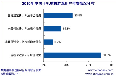 根據(jù)調(diào)研顯示,手機(jī)單機(jī)游戲中,有76.4%的用戶(hù)都有過(guò)付費(fèi)經(jīng)歷,但有25.8%的用戶(hù)表示今后將不在付費(fèi),出現(xiàn)這種現(xiàn)象原因有多種,主要還是存在損害用戶(hù)行為經(jīng)常發(fā)生,外加上眾多與PC交叉用戶(hù)的涌入,而這些用戶(hù)中免費(fèi)的、盜版的、破解的成為他們的首選,因此預(yù)計(jì)未來(lái)單機(jī)游戲的付費(fèi)比例還將下降。