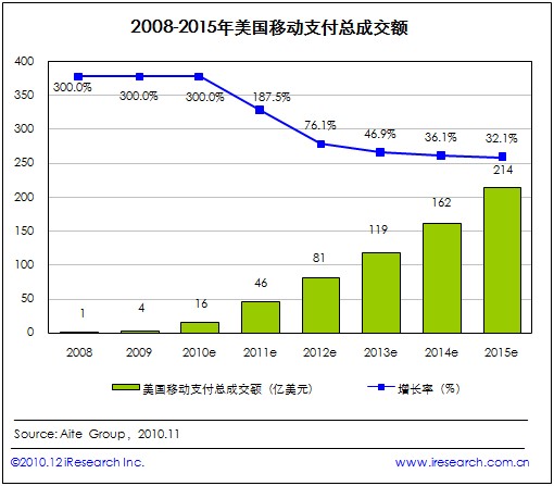 艾瑞咨詢根據(jù)Aite Group發(fā)布的數(shù)據(jù)發(fā)現(xiàn),2010年美國(guó)移動(dòng)支付總成交金額預(yù)估值為16億美元,預(yù)計(jì)2015年這一數(shù)字將攀升至214億美元,將是2010年的13.4倍,復(fù)合年增長(zhǎng)率為68%。長(zhǎng)期以來,美國(guó)移動(dòng)支付總成交額一直處于被低估的狀態(tài),但它的實(shí)際表現(xiàn)遠(yuǎn)比預(yù)想要好很多。其中,2010年到2011年增長(zhǎng)率將高達(dá)187%。