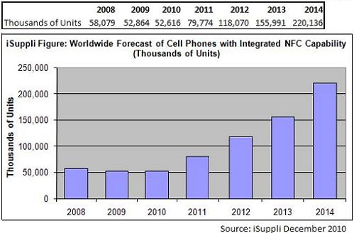據(jù)市調(diào)機構(gòu)iSuppli預(yù)估,到2014年,全球內(nèi)建NFC的手機出貨量可望達到2.201億部,2010年該數(shù)字為5,260萬部。到了2014年,約有13%的手機內(nèi)建NFC功能,而2010年該數(shù)字為4.1%。