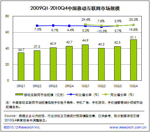根據(jù)艾瑞咨詢即將發(fā)布的2010年第四季度中國移動互聯(lián)網(wǎng)市場監(jiān)測數(shù)據(jù)顯示,2010Q4中國移動互聯(lián)網(wǎng)市場整體規(guī)模達(dá)到51.1億,同比增長19.8%,環(huán)比增長20.3%。艾瑞咨詢分析認(rèn)為,本季度電信運(yùn)營商對計費(fèi)通道治理開始收尾,移動增值市場整體復(fù)蘇。同時手機(jī)電子商務(wù)、手機(jī)游戲業(yè)務(wù)領(lǐng)域取得良好市場表現(xiàn),受手機(jī)應(yīng)用商店、位置簽到服務(wù)等新型手機(jī)業(yè)務(wù)創(chuàng)新的帶動,移動互聯(lián)網(wǎng)規(guī)?傮w攀升,投融資比重增加。