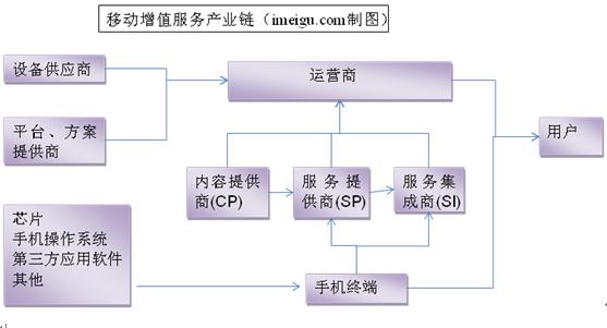 在移動(dòng)增值服務(wù)產(chǎn)業(yè)鏈當(dāng)中,運(yùn)營(yíng)商仍然處于核心地位。因?yàn)樗莆沼脩糍Y源和收費(fèi)渠道、具有網(wǎng)絡(luò)資源優(yōu)勢(shì),所以在移動(dòng)增值業(yè)務(wù)收入上 ,它可以完全獲得網(wǎng)絡(luò)流量費(fèi)、獲得消息類業(yè)務(wù)的絕大部分,并且獲得內(nèi)容和服務(wù)的收入分成,部分市場(chǎng)這一分成比例高達(dá)50%。內(nèi)容提供商(CP)、服務(wù)提供商(SP)、服務(wù)集成商(SI)統(tǒng)稱為增值服務(wù)提供商。中國(guó)的移動(dòng)增值業(yè)務(wù)提供商,規(guī)模一般較小,依附于網(wǎng)絡(luò)運(yùn)營(yíng)商,依靠分成生存,受總體經(jīng)濟(jì)形勢(shì)和市場(chǎng)本身發(fā)展影響大,2008年增值電信業(yè)務(wù)經(jīng)營(yíng)者數(shù)量首次出現(xiàn)負(fù)增長(zhǎng),經(jīng)營(yíng)者數(shù)量同比減少5%,目前數(shù)量近2萬家。