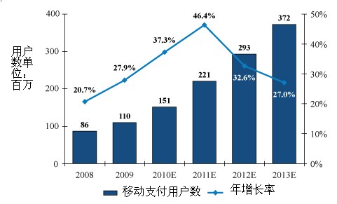 基于“中國(guó)計(jì)算機(jī)世界”的研究預(yù)測(cè),中國(guó)移動(dòng)支付用戶在2009年底達(dá)到1.1億,預(yù)計(jì)將在2013年超過3倍。由于需求大幅提高,電信運(yùn)營(yíng)商會(huì)繼續(xù)在每個(gè)省推出移動(dòng)支付解決方案網(wǎng)絡(luò)。反過來,也會(huì)刺激第三方平臺(tái)和供應(yīng)商的發(fā)展。