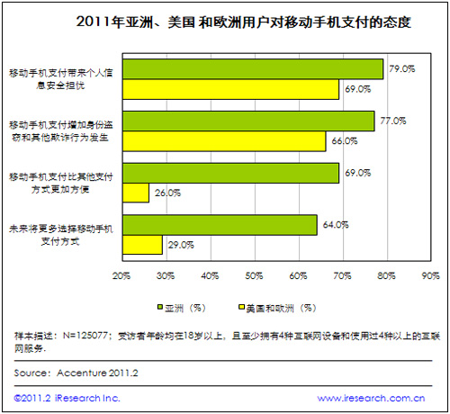 iResearch艾瑞咨詢根據(jù)Accenture的研究調(diào)查數(shù)據(jù)發(fā)現(xiàn),移動手機(jī)支付安全問題受到全球用戶的普遍關(guān)心。根據(jù)2011年Accenture對亞洲、美國以及歐洲125077位手機(jī)用戶進(jìn)行的網(wǎng)上調(diào)查顯示,亞洲79%的受訪者擔(dān)心移動手機(jī)支付帶來的個人信息安全隱患,77%的受訪者擔(dān)心身份盜竊和其他欺詐行為的發(fā)生;美國和歐洲擔(dān)心以上安全問題的用戶也分別占到69%和66%。
