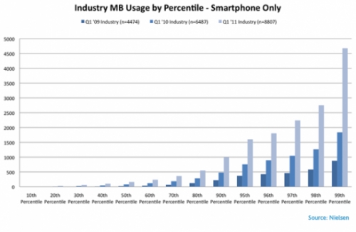 研究公司Nielsen經(jīng)過(guò)統(tǒng)計(jì),發(fā)現(xiàn)從去年第一季度到今年第一季度,移動(dòng)數(shù)據(jù)的使用量增長(zhǎng)了89%。一年前人平均使用量只有230M,而目前飆升至435M。這促使運(yùn)營(yíng)商重新考慮其最優(yōu)數(shù)據(jù)提供量,以前是250M,現(xiàn)在已經(jīng)遠(yuǎn)遠(yuǎn)不能滿足需求。