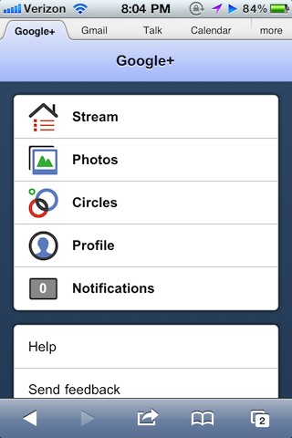 Google+移動(dòng)Web應(yīng)用幾乎實(shí)現(xiàn)了與Safari瀏覽器的完美兼容。只要用iOS Safari瀏覽器向plus.google.com網(wǎng)站發(fā)一封郵件,用戶就會(huì)收到一個(gè)用HTML5編寫的Web應(yīng)用。雖然用戶用它無(wú)法像Huddle(群聊工具)等原生應(yīng)用(native app)那樣做到無(wú)所不能,但Google+的主要功能都在里面。Stream、Photos、Circles、Profile和Notifications均出現(xiàn)在主菜單。