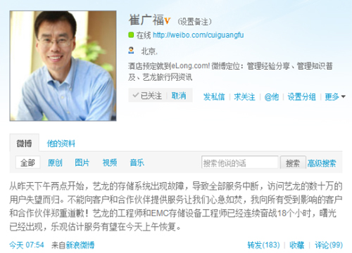 今日上午7:54,崔廣福通過微博對(duì)外證實(shí),藝龍網(wǎng)站的無法訪問,是由于存儲(chǔ)系統(tǒng)出現(xiàn)故障,導(dǎo)致全部服務(wù)中斷,因此讓訪問藝龍的數(shù)十萬用戶失望而歸。