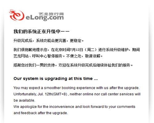 截至發(fā)稿時(shí),藝龍服務(wù)依然沒有恢復(fù)。其主頁依然顯示“我們的系統(tǒng)正在升級(jí)中……”