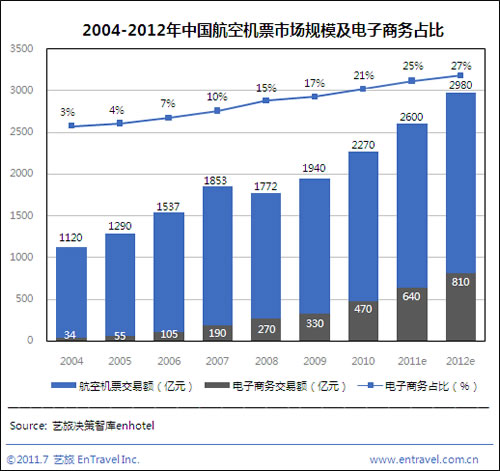 2011年上半年中國機票電子商務(wù)交易額達310億元,同期民航機票交易額為1250億元,電子商務(wù)占比升至25%,距美國45%的滲透率仍有差距。預(yù)計2011全年中國航空機票電子商務(wù)交易額將達640億元,而民航機票交易額將達2600億元。