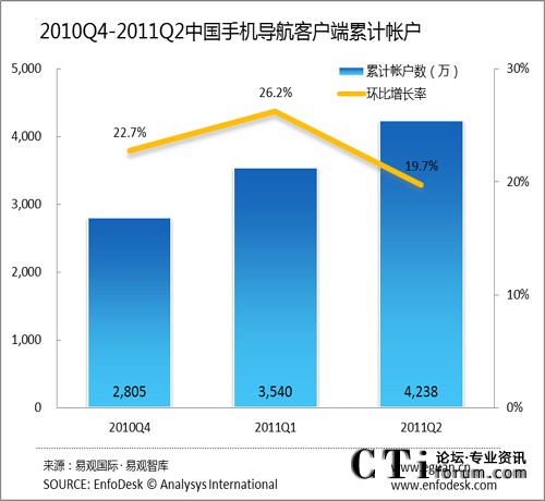 2011年Q2中國手機(jī)導(dǎo)航客戶端累計帳戶達(dá)4238萬