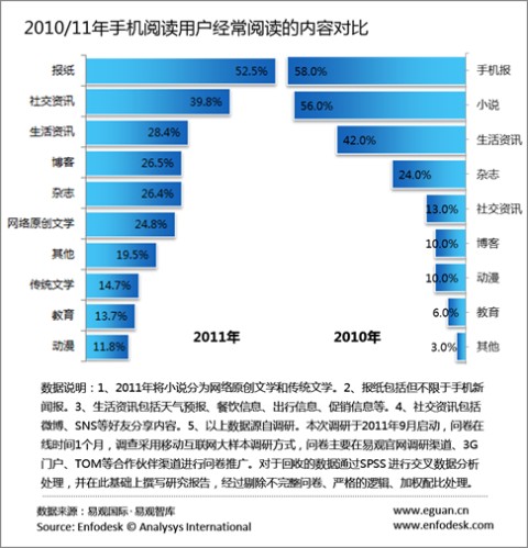 據(jù)易觀國(guó)際(Analysys International)最新報(bào)告《2011年中國(guó)手機(jī)閱讀市場(chǎng)用戶研究報(bào)告》(以下簡(jiǎn)稱《報(bào)告》)研究發(fā)現(xiàn),報(bào)紙、生活資訊、社交資訊等類微內(nèi)容超越文學(xué)作品等長(zhǎng)內(nèi)容成為手機(jī)閱讀用戶的習(xí)慣性閱讀內(nèi)容。