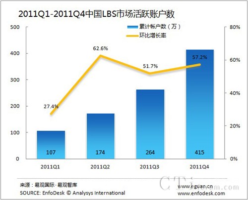 截止2011年12月底,中國移動(dòng)位置交友應(yīng)用(LBS)市場(chǎng)活躍賬戶規(guī)模達(dá)到415萬,環(huán)比增長率提升至57.2%。