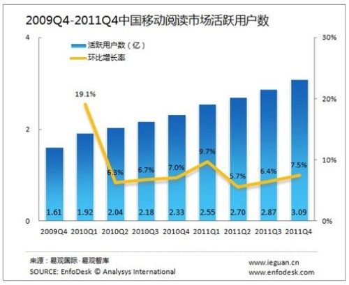 2011年第4季度中國手機閱讀活躍用戶突破3億