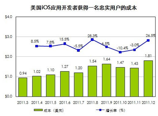 國際著名APP市場營銷組織Fiksu最新的研究數(shù)據(jù)或許能出答案。2011年12月iOS應(yīng)用開發(fā)者獲得一名忠實(shí)用戶的成本達(dá)到1.81美元,創(chuàng)下歷史新高。而在2011年第一季度,獲得一名用戶的平均成本為0.94美元,一年間單個(gè)用戶成本翻了一倍。當(dāng)用戶對蘋果商店里花樣繁多的游戲開始麻木,就需要借助有針對性的推廣策略和強(qiáng)大的執(zhí)行,讓產(chǎn)品脫穎而出。如今忠實(shí)用戶成本的提高,使得幾乎所有開發(fā)者乃至小團(tuán)隊(duì)都畏懼前期的市場推廣,大中型開發(fā)公司可利用自身的資源循環(huán)造血拉動用戶,越是小的開發(fā)團(tuán)隊(duì)成功的幾率就越渺茫,而被吞并的可能性則大增。
