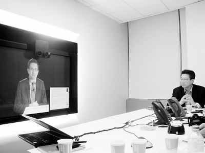 圖:Orange網(wǎng)絡(luò)解決方案業(yè)務部副總裁Nicolas Roy在巴黎演講,Orange中國區(qū)首席技術(shù)官劉昕(右)在主持北京視頻會議現(xiàn)場