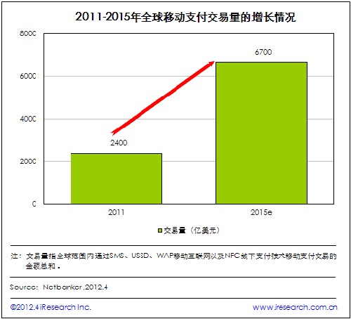 iResearch艾瑞咨詢整理Netbanker的最新數(shù)據(jù)發(fā)現(xiàn),2011年全球移動支付交易量達到2400億美元。該統(tǒng)計數(shù)據(jù)顯示,2015年全球移動支付交易量將達到6700億美元,使用手機銀行應用程序的用戶數(shù)量較2010年將增加45%左右。另外,預計在未來18個月內還會有20個國家增設NFC服務。