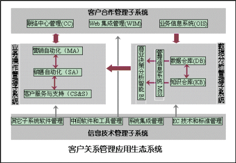 由上述四個(gè)子系統(tǒng)組成的客戶(hù)關(guān)系管理的生態(tài)系統(tǒng),基本的結(jié)構(gòu)和體系可如下圖所示: