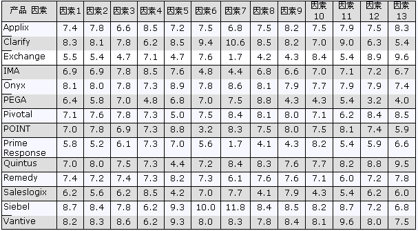 下表摘自Gartner Group 2000年六月份對(duì)14種CRM廠商和產(chǎn)品的比較。原來(lái)的報(bào)告以柱狀圖的形式進(jìn)行比較,為了縮短篇幅,我們轉(zhuǎn)化為表格形式借以引用。