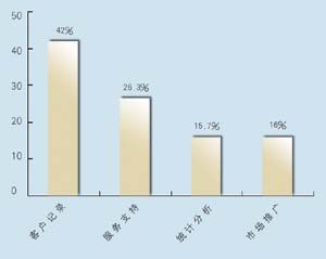 關(guān)于所應(yīng)用的CRM類型,有5家是呼叫中心,5家是分析型,7家是運營型,2家是屬于大型企業(yè)CRM。其中13家擁有動態(tài)客戶數(shù)據(jù)庫,占到68.4%。這其中又有42%利用數(shù)據(jù)庫作客戶記錄,26.3%作為客戶支持使用,15.7%用作統(tǒng)計分析,另有16%作為市場推廣。保險公司與客戶聯(lián)系的方式,從重要性來看依次為:面對面\電話\網(wǎng)絡(luò)\傳真,這說明保險公司對于與客戶進(jìn)行人性化交流的重視。在問到CRM的主要作用時,有5家表示使用CRM有助于保險業(yè)了解自身的經(jīng)營情況,幫助公司準(zhǔn)確地發(fā)現(xiàn)贏利客戶和具有贏利潛力的客戶,有7家認(rèn)為使用CRM有助于分析客戶的消費傾向,有7家認(rèn)為使用CRM有助于優(yōu)化信息和資源管理。在問到是否愿意為像CRM系統(tǒng)這樣的咨詢或服務(wù)付費時,有11家表示愿意,占到57.8%。