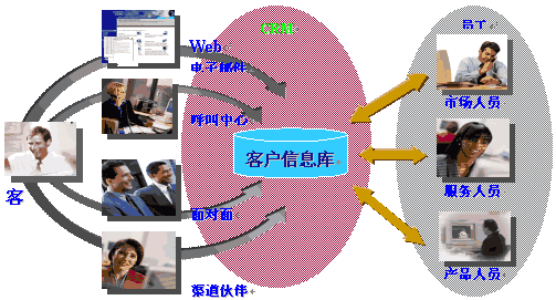 CRM是在90年代,隨著Internet的發(fā)展成熟起來(lái)。它充分利用了Internet技術(shù),通過(guò)電話中心、網(wǎng)站、電子郵件、移動(dòng)技術(shù)的使用,提供客戶多種形式的渠道,完成銷售、服務(wù)、市場(chǎng)等多種職能和流程,滿足客戶不同種類、不同層次的需求。這些渠道全方位地收集客戶信息,并通過(guò)集中的數(shù)據(jù)庫(kù)進(jìn)行管理和共享。而數(shù)據(jù)挖掘技術(shù)幫助企業(yè)進(jìn)一步分析客戶需求,提供決策支持。如下圖(資料來(lái)源:Siebel公司)。