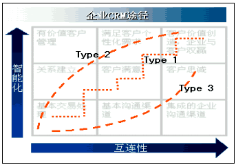 1是"小步快跑"型,Type 2是"改革優(yōu)先"型,Type 3是"技術(shù)驅(qū)動(dòng)"型,如下圖所示。圖中互連性,表示企業(yè)信息化環(huán)境建設(shè)的規(guī)模,也意味著企業(yè)與客戶的交互程度,即溝通能力;縱坐標(biāo)所示的智能化,代表管理思想、管理模式、知識(shí)應(yīng)用和情感投入,是客戶關(guān)系管理中人性化和價(jià)值衡量的雙重體現(xiàn)。