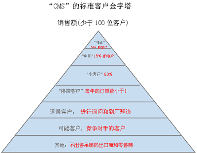 搜集了去年的銷(xiāo)售數(shù)量之后,“CMS”得出了以下的客戶(hù)金字塔。由于高端20%的核心客戶(hù)占總收入的80%,因此使用以上的方法來(lái)保留他們很重要。除此之外,對(duì)該公司來(lái)說(shuō)通過(guò)獲取歐洲和南美地區(qū)的新客戶(hù)來(lái)增加客戶(hù)基數(shù)也是十分必要的。