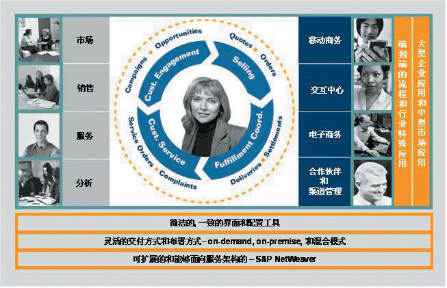 mySAP CRM不僅包含了企業(yè)市場營銷、銷售、服務(wù)、分析等功能,還通過渠道伙伴、現(xiàn)場和移動商務(wù)、交互中心、電子商務(wù)等各種交互渠道形成完整的閉環(huán)式設(shè)計的解決方案。在提供深入的行業(yè)應用和傳統(tǒng)的部署方式的同時,mySAP