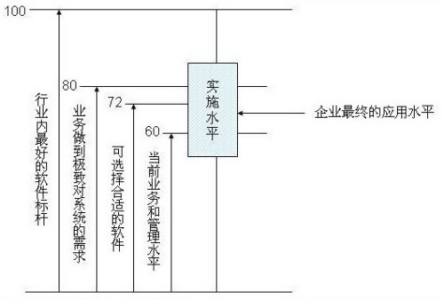 如果用一個數(shù)量化的概念來表達的話,假定行業(yè)內(nèi)最好的軟件是100分,企業(yè)做到極致對系統(tǒng)的需求可能是80分,當然也可能沒有一個軟件能滿足企業(yè)所有的需求,但從整體上,一個企業(yè)的主體需求一定在行業(yè)內(nèi)最好的軟件標桿之下。而當前的業(yè)務(wù)和管理水平一般到不了極致,假設(shè)是60分,那選擇的軟件70-75分一定是合適的,高于當前需求,而不要高得太多,最終的實施水平是一個區(qū)間,這取決于實施商的能力和企業(yè)的能力,可能會低于企業(yè)當前業(yè)務(wù)和管理水平,也可能使系統(tǒng)超水平發(fā)揮,而企業(yè)最終的應(yīng)用水平一般就在這個區(qū)間里游動了。這個模型看起來很理論化,操作時需要考慮很多的因素,但是非常有價值的判斷標準。