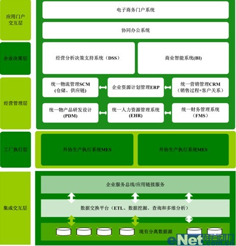 根據(jù)企業(yè)管理發(fā)展戰(zhàn)略及目標(biāo),需要考慮建設(shè)“集成化數(shù)字管控制造系統(tǒng)”,涵蓋企業(yè)決策層、企業(yè)經(jīng)營管理層。根據(jù)整體業(yè)務(wù)模式,企業(yè)經(jīng)營管理層又可以進一步分解為公司管理層和工廠執(zhí)行層;從信息化戰(zhàn)略支撐角度可以分解為企業(yè)門戶交互層、應(yīng)用系統(tǒng)層、應(yīng)用集成層和網(wǎng)絡(luò)支撐層。實現(xiàn)企業(yè)信息流、資金流、物流、商物流的高度集成、統(tǒng)一,為企業(yè)生產(chǎn)、經(jīng)營提供強有力的信息化支撐。