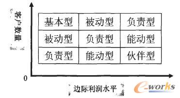 這5種類型之間并不具有簡單的優(yōu)劣對比或順序,因?yàn)槠髽I(yè)所采用的客戶關(guān)系類型取決它的產(chǎn)品以及客戶的特征,不同企業(yè)甚至同一企業(yè)在對待不同客戶時,都有可能采用不同的客戶類型。一家生產(chǎn)日用化妝品的企業(yè),與它的化妝品消費(fèi)者個人之間常會建立一種被動型的客戶關(guān)系,企業(yè)設(shè)立的客戶服務(wù)機(jī)構(gòu)或聯(lián)絡(luò)中心將聽取客戶的意見,處理客戶投訴以及改進(jìn)產(chǎn)品;但這家企業(yè)同大型超市或零售企業(yè),同連鎖的美容產(chǎn)業(yè)機(jī)構(gòu)之間,?赡芙⒁环N伙伴型的客戶關(guān)系,實(shí)現(xiàn)產(chǎn)銷企業(yè)之間的互惠互利?铺乩仗岢,企業(yè)可以根據(jù)其客戶的數(shù)量以及產(chǎn)品的邊際利潤水平,根據(jù)圖3指示的思路,選擇合適的客戶關(guān)系類型。