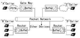 網(wǎng)關(guān)(Gate Way) 網(wǎng)關(guān)是在PSTN和分組交換網(wǎng)之間傳輸呼叫的器件,包括語音編碼器、回音抑制器、靜音抑制、收/發(fā)緩存器和分組交換網(wǎng)的排序管理等部分,如圖2所示。