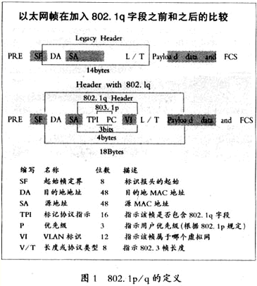 Identifier,虛擬網(wǎng)標(biāo)識(shí))位識(shí)別傳送的幀究竟屬于哪一個(gè)虛網(wǎng)。VI位共有12位,最大可以支持的虛網(wǎng)個(gè)數(shù)不會(huì)超過4096個(gè)。 802.1p/q的具體定義可以參見圖1。