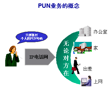 PUN業(yè)務首先給注冊用戶分配一個號碼,此號碼根據(jù)運營商所申請到的網(wǎng)號及用戶規(guī)模來規(guī)劃,如181XXXXXXX,申請到該號碼后,用戶可以通過各種方便的方式(如上網(wǎng)、打電話)等將此號碼綁定到任一特定終端,如家庭電話,移動手機等,綁定以后,任何人在任何地點都可以通過拔打此號碼,PUN系統(tǒng)將會根據(jù)用戶的設置,將此呼叫經(jīng)IP網(wǎng)絡送至對應的終端,從而完成呼叫,PUN用戶還可以設置繁雜的規(guī)劃,如當手機關機時,將呼叫送至某一固定電話,或在用戶上網(wǎng)時,首選PC機作為呼叫終端,也可以根據(jù)時間段來靈活設置終端,其設置方法也比傳統(tǒng)的呼叫轉(zhuǎn)移更加方便和靈活。其圖一: