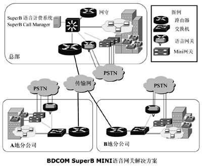 根據(jù)西北石油公司各地分公司電話全部是PSTN直線電話,沒有單位內部的PBX,不能通過語音網(wǎng)關把這些直線電話統(tǒng)一接入到IP網(wǎng)絡上這一實際情況,方案提供方博達公司提供了一款小型BDCOM SuperB Mini語音網(wǎng)關,來解決PSTN程控電話統(tǒng)一接入IP語音網(wǎng)絡的問題。使用BDCOM SuperB Mini并結合西北石油公司組建的企業(yè)內部VoIP網(wǎng)絡,克服了傳統(tǒng)語音網(wǎng)關解決方案的不足和缺點。