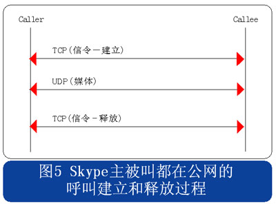 從上述流程圖可見,Skype的呼叫信令都采用TCP封裝,而媒體流則使用UDP封裝,當有任何一方用戶位于限制UDP包的防火墻內(nèi)時,媒體流就會采用TCP封裝。另外當Skype用戶至少有一方位于私網(wǎng)內(nèi)時,所有的信令和媒體消息都經(jīng)過一個或多個中間節(jié)點轉(zhuǎn)發(fā)。此時無需擔心用戶通話的媒體流因為經(jīng)過中間節(jié)點轉(zhuǎn)發(fā)而被竊聽,因為Skype采用了對消息進行端到端加密的機制。