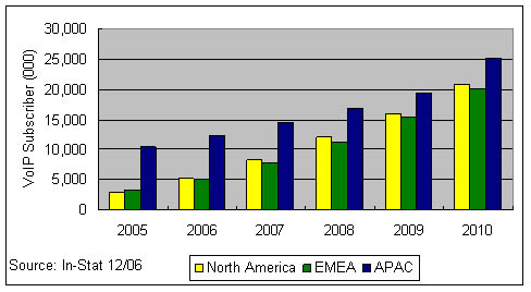 應(yīng)該說在2006年,VoIP技術(shù)已經(jīng)不是阻礙其市場發(fā)展的主要因素,因為In-Stat在全球個人VoIP消費市場中作的調(diào)查顯示,約9%的VoIP用戶甚至不清楚自己在使用IP傳輸;有64%的用戶在使用免費的VoIP服務(wù)。其次有超過73%的用戶并不把是否使用IP技術(shù)當(dāng)成選擇該業(yè)務(wù)的影響因素。而寬帶接入市場的競爭則構(gòu)成了VoIP發(fā)展的關(guān)鍵因素,作為一種寬帶應(yīng)用,誰的接入資源占據(jù)了用戶家庭,誰就可以決定是否采用VoIP技術(shù)來提供語音業(yè)務(wù)。在歐洲法國Free Telecom與意大利的FastWeb都是三重播放業(yè)務(wù)的積極推進者,在VoIP市場居領(lǐng)先地位;在日本Yahoo!BB擁有亞洲地區(qū)50%的寬帶VoIP用戶。幾乎所有這些寬帶ISP提供商往往采用包月的形式或者以極低的費用提供無限制的本地或國內(nèi)通話,在國際長途電話上提供極大的折扣。