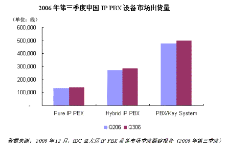 根據(jù)《IDC亞太區(qū)IP PBX市場(chǎng)季度跟蹤報(bào)告(2006年第三季度)》中國(guó)部分?jǐn)?shù)據(jù)顯示,2006年第三季度中國(guó)PBX系統(tǒng)出貨量接近100萬線,其中純IP PBX占到15.1%,混合PBX占到30.9%,傳統(tǒng)PBX占到54%。