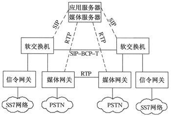 在VoIP業(yè)務(wù)的網(wǎng)絡(luò)環(huán)境中,主要有軟交換機(jī)(Softswitch)、媒體網(wǎng)關(guān)(MG)、信令網(wǎng)關(guān)(SG)和應(yīng)用服務(wù)器(ApplicationServer)4個(gè)基本控件。其業(yè)務(wù)環(huán)境如圖2所示。