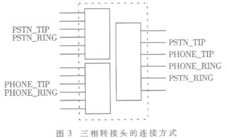 為了有效利用資源,系統(tǒng)使用三相轉接頭將電話線路與PSTN線路組合到一個RJ11接口上,每路話路使用一個三相轉接頭。三相轉接頭的連接方式如圖3所示。