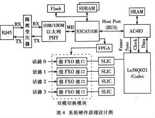 本節(jié)提出了一種基于H.323的雙模網關的系統(tǒng)設計方案,該方案支持4路話音,使用一種經濟實用的“假FXO接口”方式實現(xiàn)雙模切換,能夠在VoIP通話時檢測到PSTN線上進來的呼叫并可通過按話機的拍簧或者Flash閃斷鍵切換接聽。
