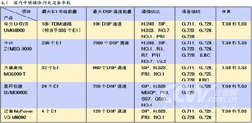結(jié)合表2中的數(shù)據(jù),可以看出國內(nèi)中繼媒體網(wǎng)關(guān)設(shè)備制造商的定位非常類似于軟交換設(shè)備的市場(chǎng)定位,從設(shè)備支持的最大E1數(shù)和最大DSP通道數(shù)來看,華為和中興的中繼媒體網(wǎng)關(guān)主要是面向運(yùn)營商客戶,不難發(fā)現(xiàn)網(wǎng)關(guān)支持的協(xié)議也最為豐富,能夠滿足和運(yùn)營商不同協(xié)議體系網(wǎng)絡(luò)互通的需要。而大唐高鴻、星網(wǎng)銳捷和邁普的中繼媒體網(wǎng)關(guān)主要定位在企業(yè)行業(yè)客戶。