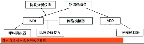 我國通信行業(yè)國家標(biāo)準(zhǔn)《基于軟交換的綜合接入設(shè)備測(cè)試方法》中明確了IAD設(shè)備九個(gè)大項(xiàng)的測(cè)試,分別是基本功能測(cè)試、協(xié)議測(cè)試、接口測(cè)試、話音業(yè)務(wù)測(cè)試、數(shù)據(jù)業(yè)務(wù)測(cè)試、性能測(cè)試、OAM測(cè)試、硬件項(xiàng)目測(cè)試和環(huán)境測(cè)試。按照?qǐng)D4所示的測(cè)試拓?fù)鋱D進(jìn)行連接,就可以按照測(cè)試方法中的測(cè)項(xiàng)要求,逐一得出測(cè)試結(jié)果。