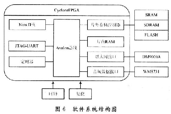 SOPC系統(tǒng)的平臺(tái)包括:Altera的Nios處理器、Aval—on總線,片內(nèi)外存儲(chǔ)器以及外設(shè)模塊等。利用SOPCBuilder,用戶可以很方便地將處理器、存儲(chǔ)器和其他外設(shè)模塊連接起來(lái),形成一個(gè)完整的系統(tǒng)。其中,SOPC