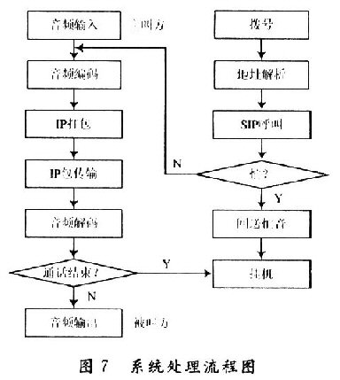 當(dāng)撥號(hào)確認(rèn)后,主控制器對(duì)編解碼器發(fā)送控制指令,開始語(yǔ)音A/D轉(zhuǎn)換,并進(jìn)行編碼,送到片外存儲(chǔ)器內(nèi)進(jìn)行緩存;Nios CPU對(duì)撥號(hào)信息的解析確定。目的地址,通過(guò)Avalon總線對(duì)以太網(wǎng)接口發(fā)送數(shù)據(jù)傳輸指令;將符合以太網(wǎng)標(biāo)準(zhǔn)的數(shù)據(jù)從片外存儲(chǔ)器內(nèi)讀出,送入Internet中,返回確認(rèn)信息。系統(tǒng)處理流程圖如圖7所示。