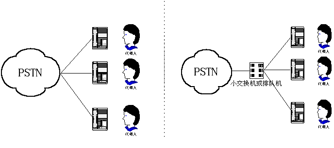 呼叫中心,早期是指一個(gè)由兩人或更多人組成的、在一個(gè)特定地方用專用設(shè)備處理電話業(yè)務(wù)的小組。這些人就是通常所說(shuō)的呼叫中心代理(人)。一個(gè)呼叫中心可以只提供信息接收服務(wù),或者只提供信息發(fā)送服務(wù),或者是一個(gè)混合式呼叫中心,其呼叫中心代理會(huì)負(fù)責(zé)所有這兩項(xiàng)工作。從物理設(shè)備構(gòu)成來(lái)看,第一代呼叫中心可用下圖(1)、(2)表示。