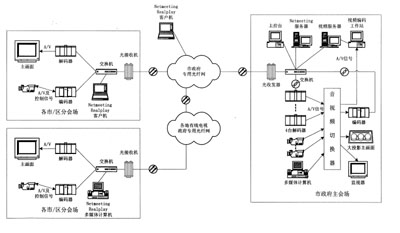 高清晰度視像會議系統(tǒng)的工作原理如圖所示。其中,主會場的音視頻信號經過編碼器壓縮后,由主控臺控制,并通過廣播或組播方式經由政府專用網絡分發(fā)到各分會場;各分會場的音視頻信號經過編碼器壓縮為MPEG2的數據流后,通過以太網口發(fā)送至政府專用網絡上,再上傳到主會場的解碼器上并轉換為視頻信號,經視頻陣列器處理后顯示在屏幕上;主控臺可以根據需要控制各分會場的編解碼器、電動調焦攝像機及控制器。