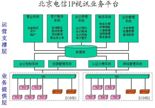 在整個運(yùn)營支撐層的系統(tǒng)中,主要包括四大系統(tǒng),即會議控制系統(tǒng)、資源管理系統(tǒng)、認(rèn)證計費(fèi)系統(tǒng)、網(wǎng)絡(luò)管理系統(tǒng)。除此之外,還有其它幾個輔助系統(tǒng),包括營業(yè)系統(tǒng)負(fù)責(zé)為客戶開戶和銷戶,終端注冊等處理;客戶服務(wù)系統(tǒng)提供咨詢服務(wù)、投訴受理、自動查詢和幫助客戶進(jìn)行會議預(yù)約,在資源不足的情況下進(jìn)行會議調(diào)度等;會議受理系統(tǒng)是面向客戶提供會議電視業(yè)務(wù)預(yù)約、會議狀態(tài)查詢、會議控制服務(wù),由用戶自助完成預(yù)約會議和控制會議的操作;賬務(wù)系統(tǒng)負(fù)責(zé)賬務(wù)方面的管理,包括賬務(wù)管理,收費(fèi)銷賬,催繳欠費(fèi)、銀行繳費(fèi)等;業(yè)務(wù)管理系統(tǒng)主要是記賬卡的卡務(wù)處理、經(jīng)營管理、查詢報表等。