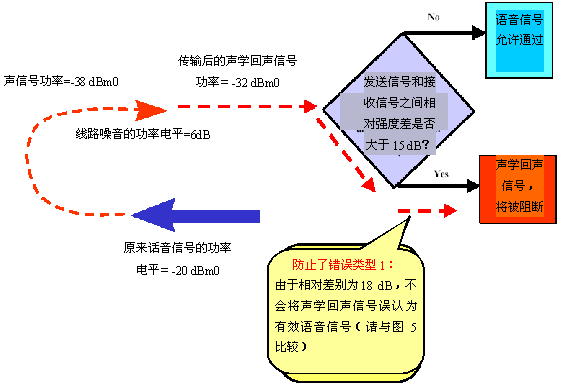 當(dāng)通信鏈路的的另一端被設(shè)計(jì)為傳輸可變強(qiáng)度的信號(hào)時(shí),"錯(cuò)誤類型1"的影響會(huì)急劇增大。在這種情況下,根據(jù)功率電平的絕對(duì)差異來決定阻斷/允許信號(hào)的聲學(xué)回聲控制器會(huì)增大"錯(cuò)誤類型1"出現(xiàn)的可能性。也就是說,使用絕對(duì)功率電平差異時(shí),將聲學(xué)回聲信號(hào)誤認(rèn)為有效語音信號(hào)的概率很大。