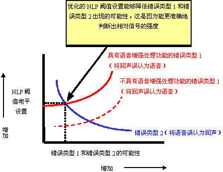 dB)能夠顯著降低將雙對(duì)話語音信號(hào)誤認(rèn)為聲學(xué)回聲信號(hào)的概率,從而防止了"錯(cuò)誤類型2"?傊,在"錯(cuò)誤類型1"(實(shí)線曲線,具有語音增強(qiáng)特性)和"錯(cuò)誤類型2"曲線的交叉點(diǎn)上,通過與之對(duì)應(yīng)的NLP設(shè)置,可以獲得最佳的性能(請(qǐng)參見圖10)。
