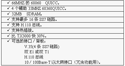 TX3000在新版軟件中可以支持冗余功能,冗余功能可以使系統(tǒng)能檢測(cè)并恢復(fù)以下各種故障:TX SS7板上的鏈路故障,信令點(diǎn)故障,或者是TX SS7板本身的故障。每對(duì)冗余TX3000卡通過(guò)一條專用以太網(wǎng)交叉電纜相連接,別的卡或設(shè)備不能連接到這一專用以太網(wǎng)連接上。TX3000的主要特性如下表所示: