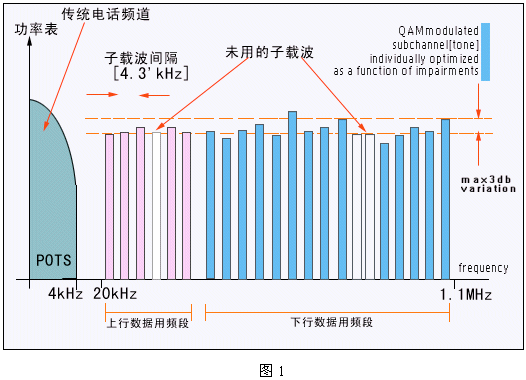 DSL技術(shù)是在人們對高速互聯(lián)網(wǎng)訪問需求推動下的產(chǎn)物。DSL利用頻率復(fù)用和OFDM調(diào)制技術(shù),在不影響傳統(tǒng)電話業(yè)務(wù)的前提下可以為用戶提供最高達(dá)8Mbps的數(shù)據(jù)傳輸速率。這個(gè)速率是基于POTS的Modem速率(以目前的最高速率56kbps為參考)的140倍;DSL技術(shù)所帶來的巨大帶寬為家庭和小型公司提供了一個(gè)寬帶數(shù)字業(yè)務(wù)的新平臺。這個(gè)DSL平臺可以支持多種寬帶業(yè)務(wù):包括高速Internet接入、虛擬專網(wǎng)及VOD等流媒體業(yè)務(wù)。其基本原理如下圖1所示: